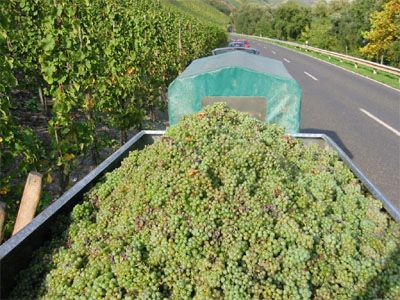 | 「陽光にきらめくリースリングぶどう」 自分がモーゼルワインの物差しにしているのがこの畑、ケステナー・パウリンスベルクだ。 毎年の「ぶどうの樹のオーナー」という企画でおなじみ。 現地を訪ねモーゼルの川風に吹かれる、ぶどう畑を踏みしめる、 それだけが目的のドイツ行きだった。自分の指を傷つけながらの収穫、 60キロものぶどうを背負って急斜面を昇り降り。そのシンドイ作業中に見えたものは、 造り手の「顔」と、お客様の「顔」だった。 写真は2001年10月11日、収穫したばかりのリースリングぶどうだ。 このままトラクターで醸造所に運ばれてワインに仕込まれる。 搾汁の結果、昨年を上回る糖度でシュペトレーゼ確定!好収穫に満足。 このぶどうで造るワインは甘みを残しているが、 シャープな酸味を併せ持つので食事(和食・寿司)によく調和する。 このワインが日本にやってくるのは来年の初夏だ。 |